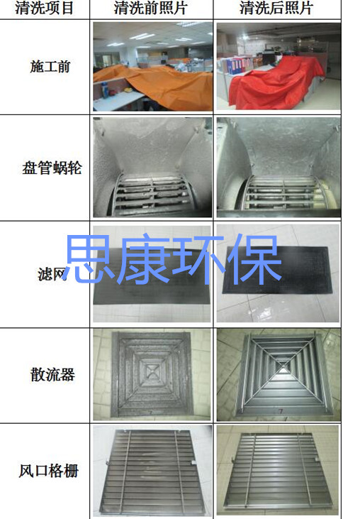 拆除各種風(fēng)口 →專業(yè)單位測(cè)定風(fēng)管內(nèi)積塵情況→放入專用檢查頭→觀察風(fēng)管內(nèi)部情況,確定清洗方案(可制作光盤)→在需清洗的風(fēng)管二頭放 置二個(gè)氣囊并于其中一邊開(kāi)一個(gè)圓形工藝孔(或利用原有出風(fēng)口),并把該孔與捕集器的吸入口用軟管聯(lián)接→再?gòu)牧硪豢趦?nèi)(或利用原有出風(fēng)口)放入風(fēng)刀或振動(dòng)鞭邊打松塵邊由捕集器同時(shí)把灰塵吸走→噴灑消毒劑→放入專用檢查頭觀察風(fēng)管清洗后情況(可制作光盤)→專業(yè)單位測(cè)定風(fēng)管清洗后情況 →安裝各種風(fēng)口→出具清洗完工報(bào)告。
