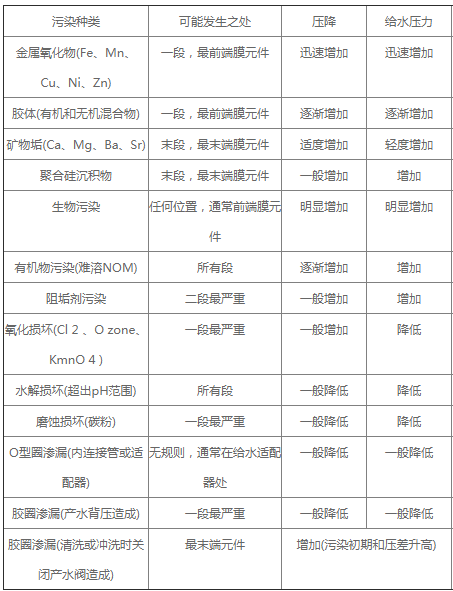 定時監(jiān)測系統(tǒng)整體性能是確認膜元件是否已發(fā)生污染的基本方法。污染對膜元件的影響是漸進的,并且影響的程度取決于污染的性質(zhì)。表1“反滲透膜污染特征及處理方法”列出了常見的污染現(xiàn)象和相應(yīng)處理方法。