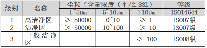潔凈度要求分三區(qū)域管理控制: