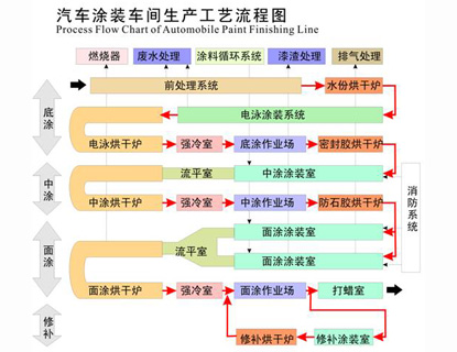 前處理電泳、電泳線、電泳材料放置區(qū)、PVC線、遮蔽線、材料放置區(qū)、噴膠室、修補(bǔ)間、控制系統(tǒng)室、化驗(yàn)室、輸送鏈等
